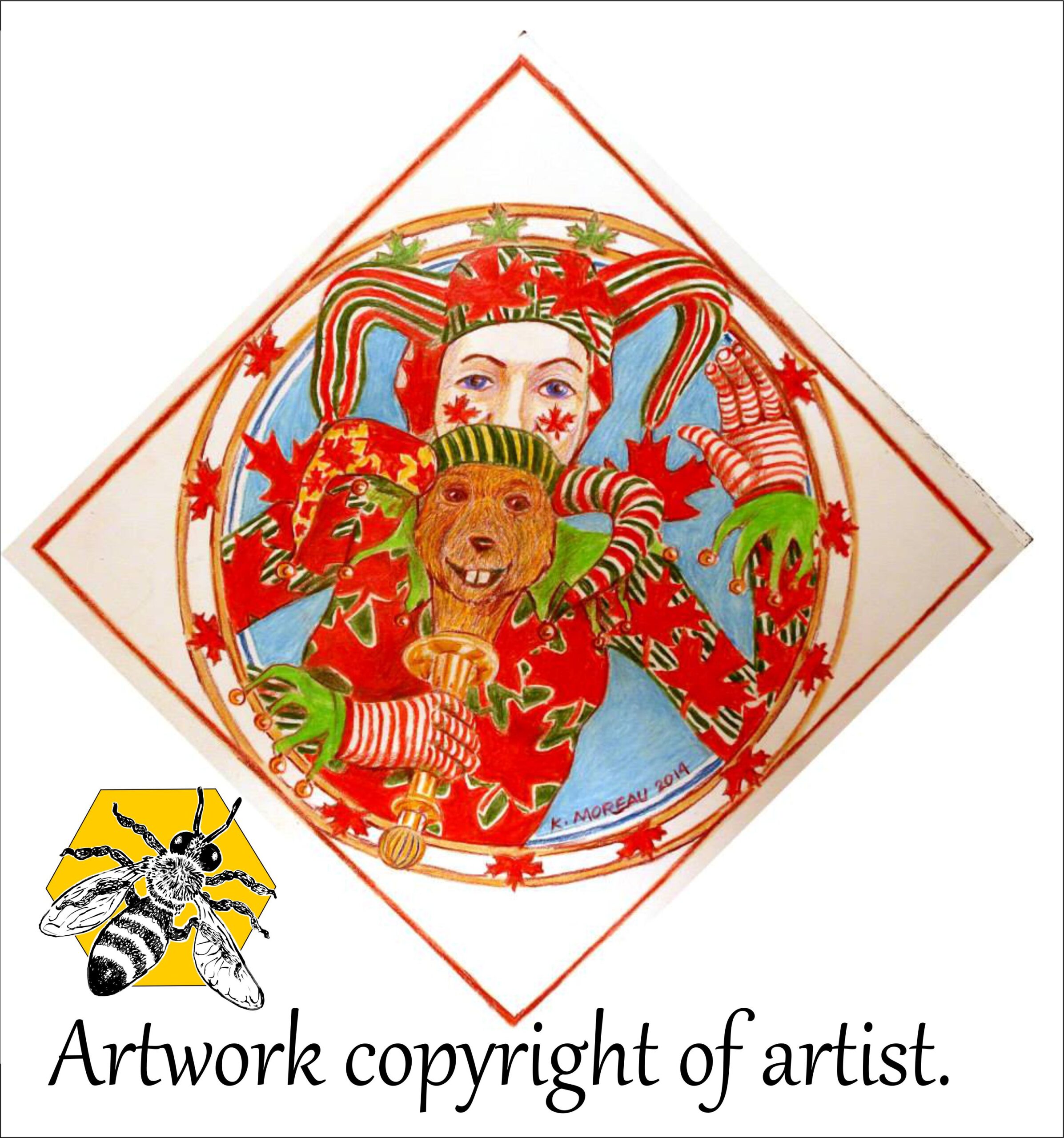 Part of the exhibit in the Canada Pavilion as part of the annual Carabram weekend in Brampton 2014. In the ring around the jester: red leaves for the ten provinces and the green leaves are for the 3 territories.