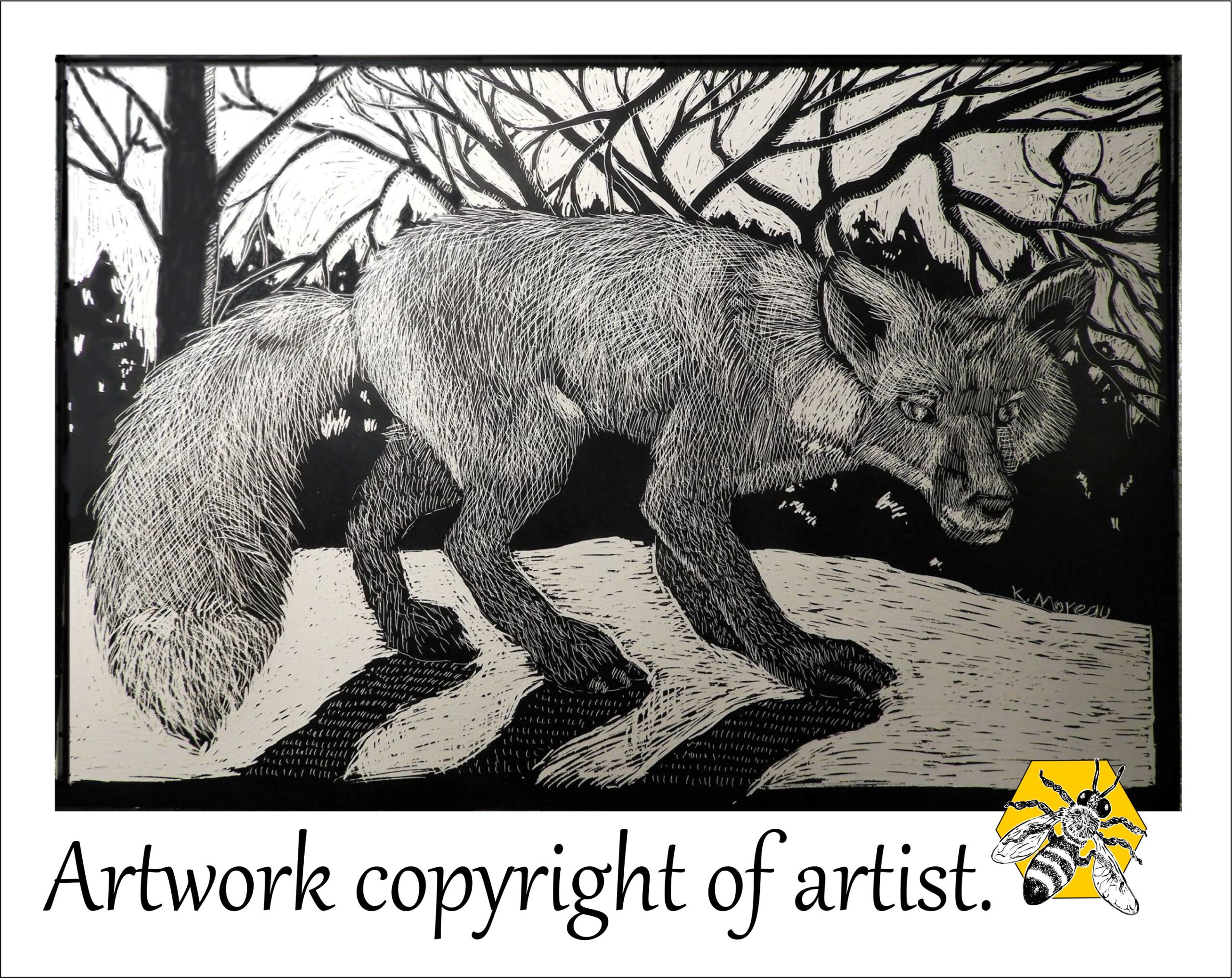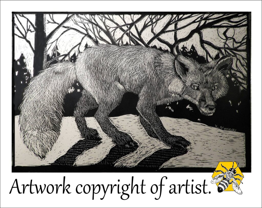 Created in scratchboard & drawn direct from a taxidermied fox specimen and creating the background from my head.