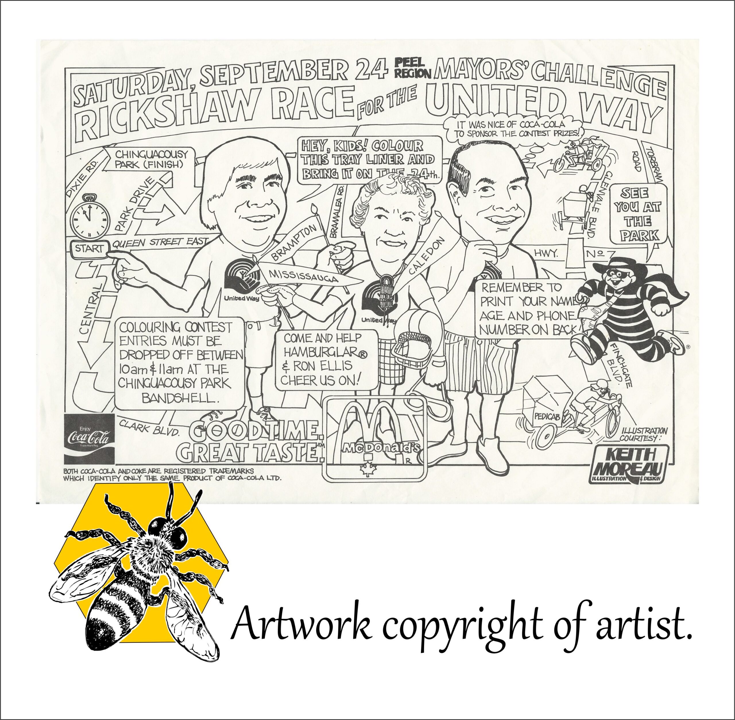 This was a commission for a fundraiser through McDonalds back when Ken Whillans was mayor of Brampton and Hazel McCallion was years from retirement. I always love the challenge this type of work entails. This was done in pen and ink. It was for United Way and I donated my expertise.